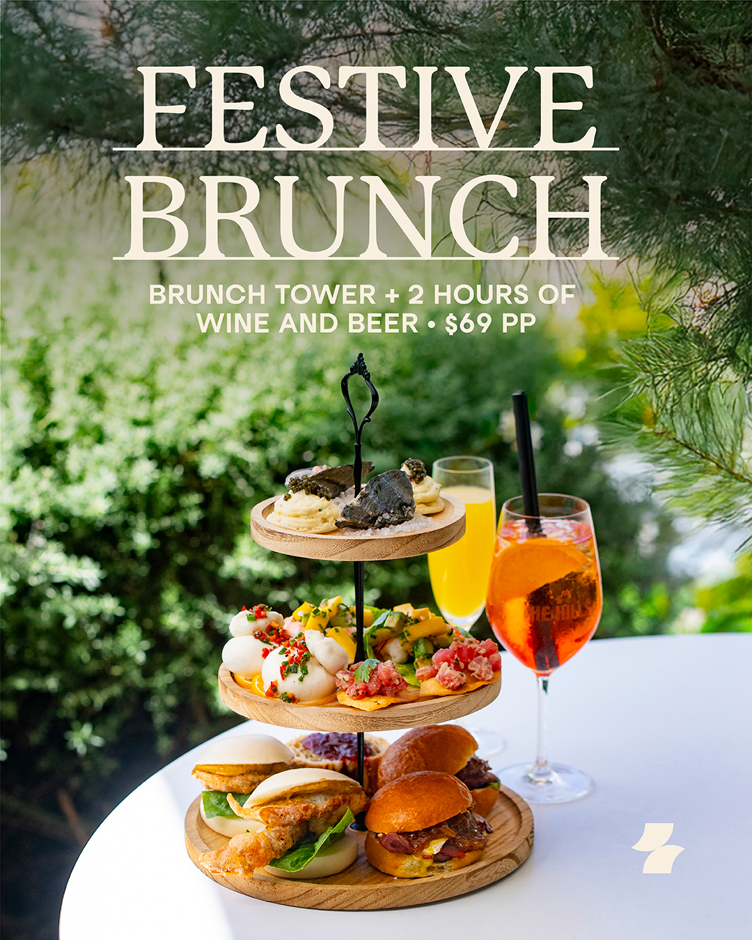 Celebrate the season with a festive take on our signature two-hour brunch at the Bakery Cafe. Enjoy a holiday-inspired share tower featuring caviar blinis, Tassie oysters, burrata, prawn and mango cups, tuna ceviche tostadas, Christmas ham sliders, turkey and sage rolls with cranberry relish, and soft-shell crab bao.